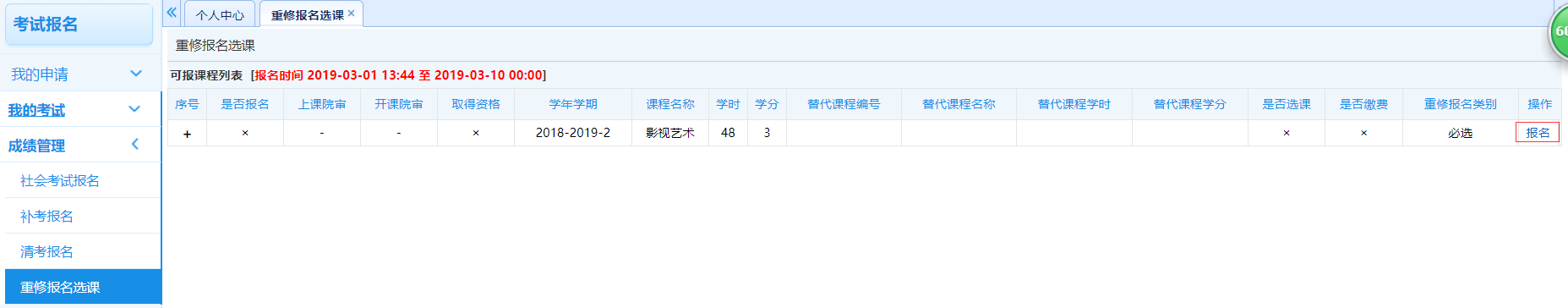 步骤2. 在要进行重修的课程后点击【报名】按钮、确认报名,即可完成重修报名操作,如下图重修报名页面。