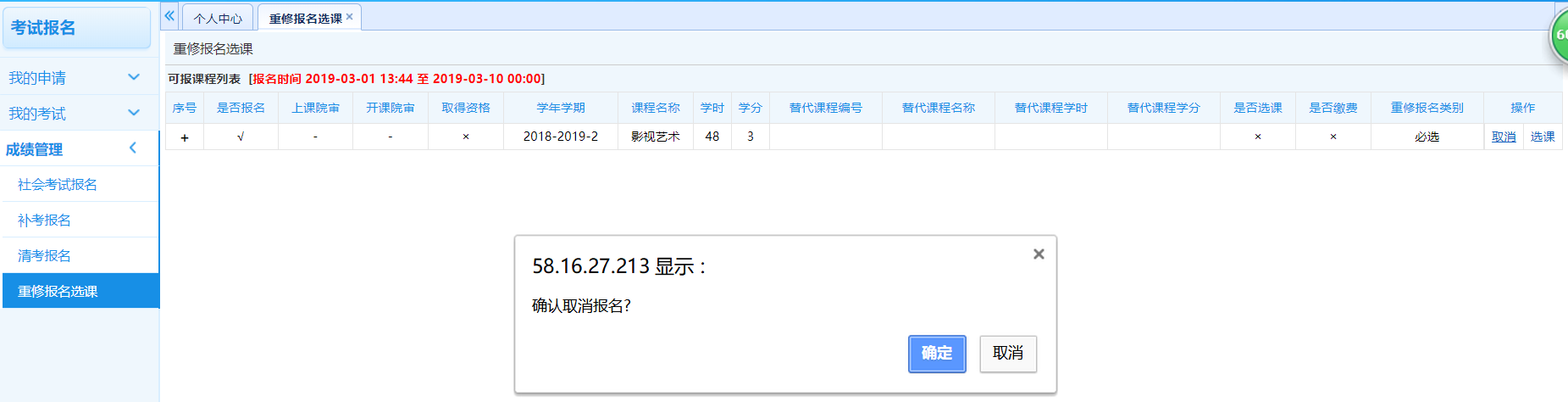 步骤3. 确认报名后,重修报名管理界面课程后出现【取消】按钮,点击【取消】按钮,确认取消报名,即可取消已报名的重修课程,如下图重修取消报名页面。