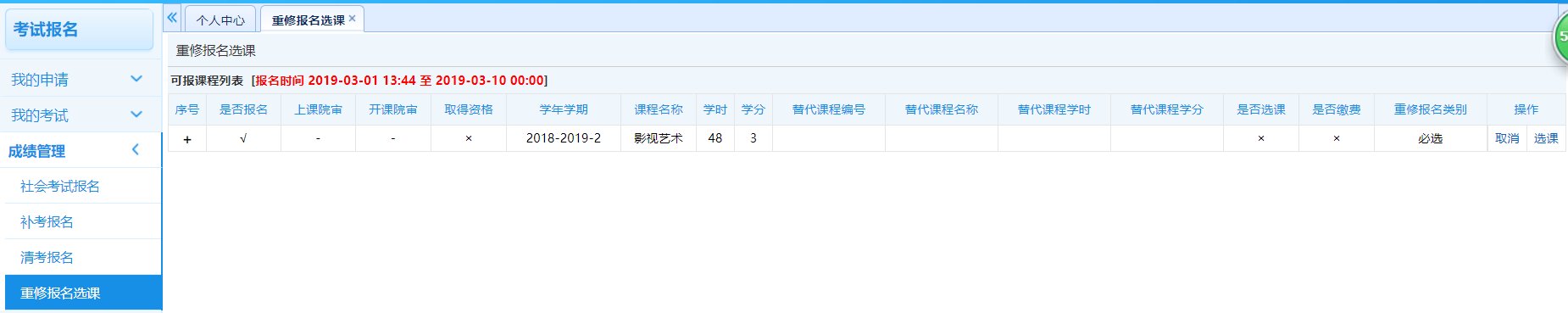 步骤1. 请依次点击【考试报名】-【重修报名选课】,即可查询出需要重修的课程,如下图重修报名选课管理页面。