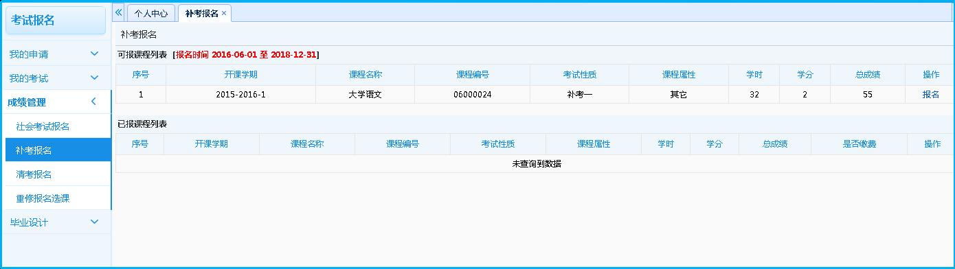步骤1. 请依次点击【考试报名】-【补考报名】,即可查询出所有可供补考报名的课程,如下图补考报名查询页面。
