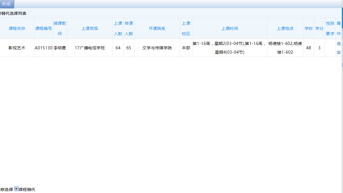 步骤4. 确认报名后,重修报名管理界面课程后出现【选课】按钮,点击【选课】按钮,弹出可选课程,在可选课程列表页面选定对应的课程,即可完成重修报名选课操作,如下图重修报名选课列表页面。