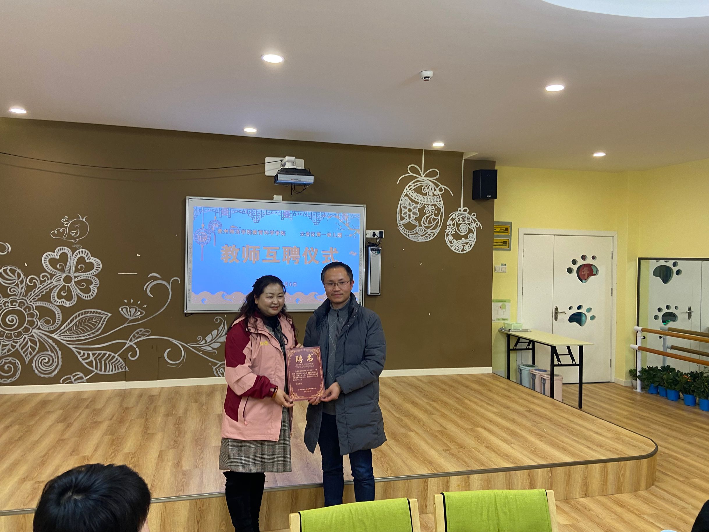 云岩区第一幼儿园副园长何莹燕为学前教育系老师们颁发聘任证书,聘任刘英为幼儿园教科研副园长,聘任王小为、陈泽婧、何玉红、李姿雨为校外指导教师;黎平辉为何莹燕颁发聘任证书,聘任其为学前教育系副系主任;娄小韵为云岩一幼4名教师颁发聘任证书,聘任其为学前教育系校外指导教师。