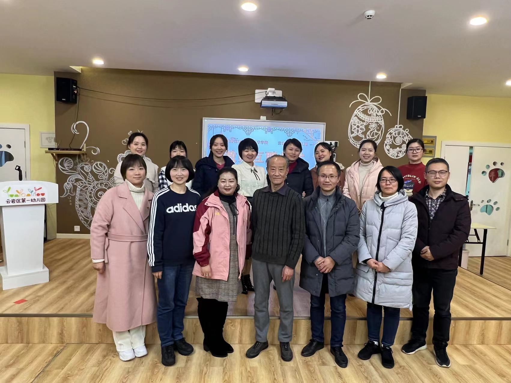 为了落实“三位一体”协同育人理念,进一步推进我院学前教育专业发展,1月6日上午,教育科学学院与云岩区第一幼儿园举行教师“双向互聘”仪式并开展专项教研活动。贵州千亿qy88国际官网入口副院长黎平辉、学前教育系主任娄小韵以及学前教育专业教师刘英、王小为、陈泽婧、李姿雨参加互聘仪式。
