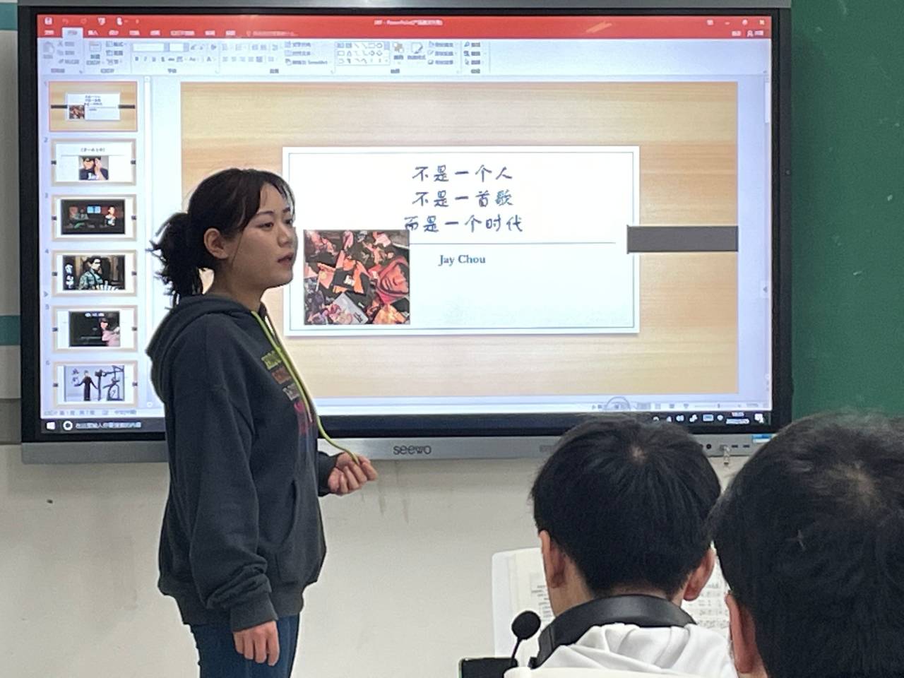 本次音乐分享会在轻松愉快的氛围下拉开了帷幕,温语珈以周杰伦的歌曲为主线,通过讲述、示范、分享等方式,让同学欣赏和感受音乐的魅力。伴随着悠扬的音乐,温语珈和陈庭瑜认真地唱起周杰伦的歌曲,清脆美妙的歌声飘荡在教室的上方,悦耳动听,让人陶醉,同学都被吸引住认真聆听,一起沉醉在这音乐的海洋世界里。