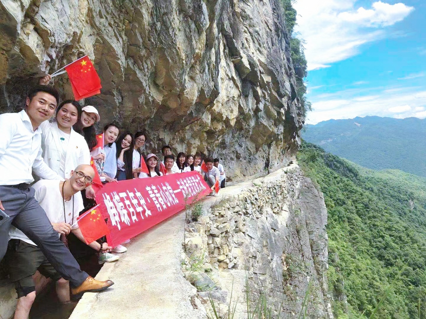 一行人早上从学校出发,中午到达遵义市播州区团结村。中午饭后首先走进了大发渠,亲身感受大发渠的险峻。走在渠边,脚下就是几百米深的悬崖。当地人指着“天渠”最险处说,一般人都不敢去。随后,下午3点,有幸聆听黄爷爷授课,他说:“我是贫困山区的一名普通党员,在人民大会堂受到习近平总书记的接见,挨着他坐,我感到非常光荣。我们做出一点小事,老百姓记得住我们,党也记得住我们,我感到无比自豪。”渠通了,水来了,草王坝也开始稻花香里说丰年。然而黄爷爷并没有歇下来,他继续带领村民拉电、修路、建学校。“我这一生就是做好工作,有一口气就要干一天,为人民奋斗一辈子。”黄爷爷嘱咐我们,踏实做好自己的岗位工作就是为国家为人民做贡献。临别时,我们为黄爷爷送上了学院的剪纸作品,黄爷爷表示非常喜欢。