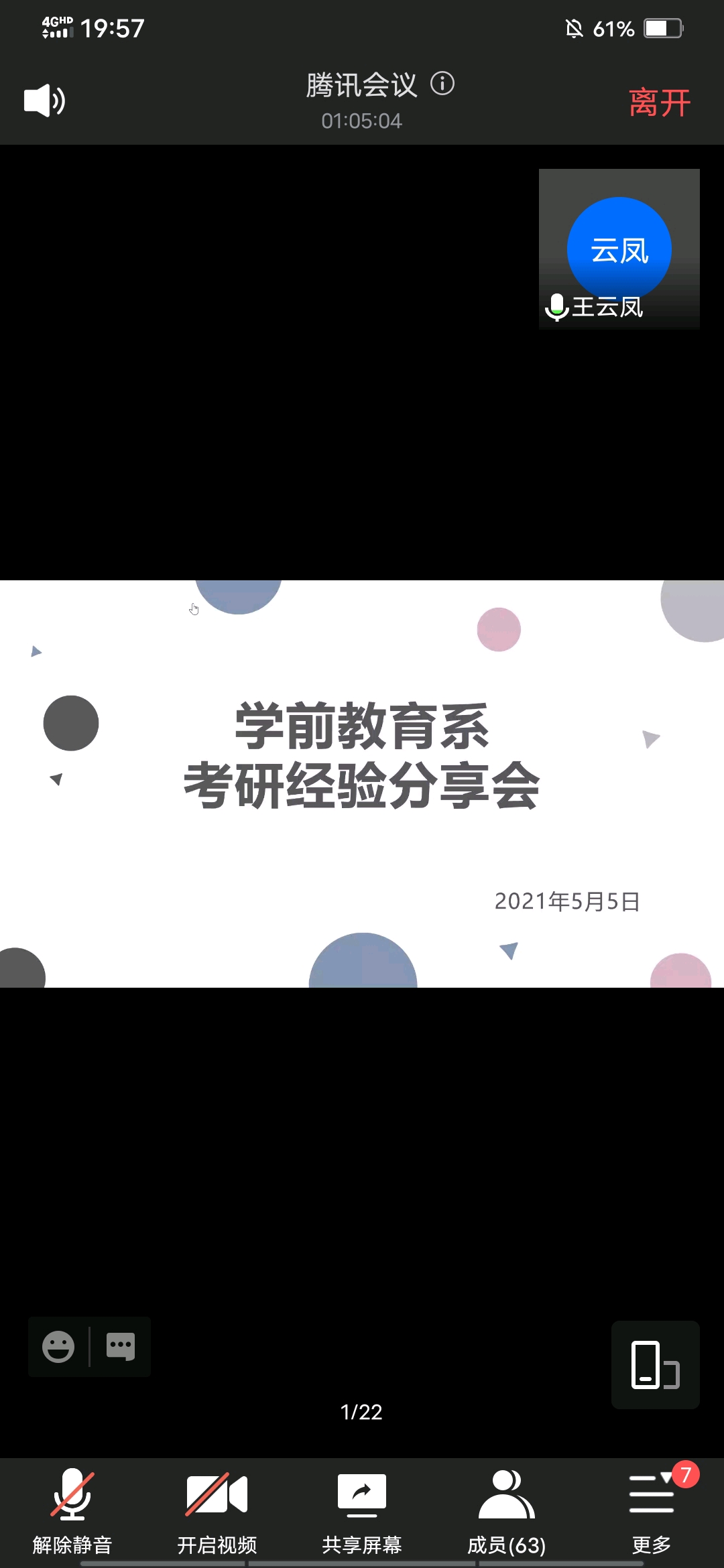 为进一步提高学生的考研热情,明确考研目标,掌握相关考研技巧,5月5日晚上7时,学前教育系考研分享会以腾讯会议线上形式进行,主要分享者为成功考上东北师范大学和云南师范大学的17级学生王云凤与王兴波,同时18、19、20级共65名学生参与,18级国家级奖学金获得者肖筱晓主持此次活动。
