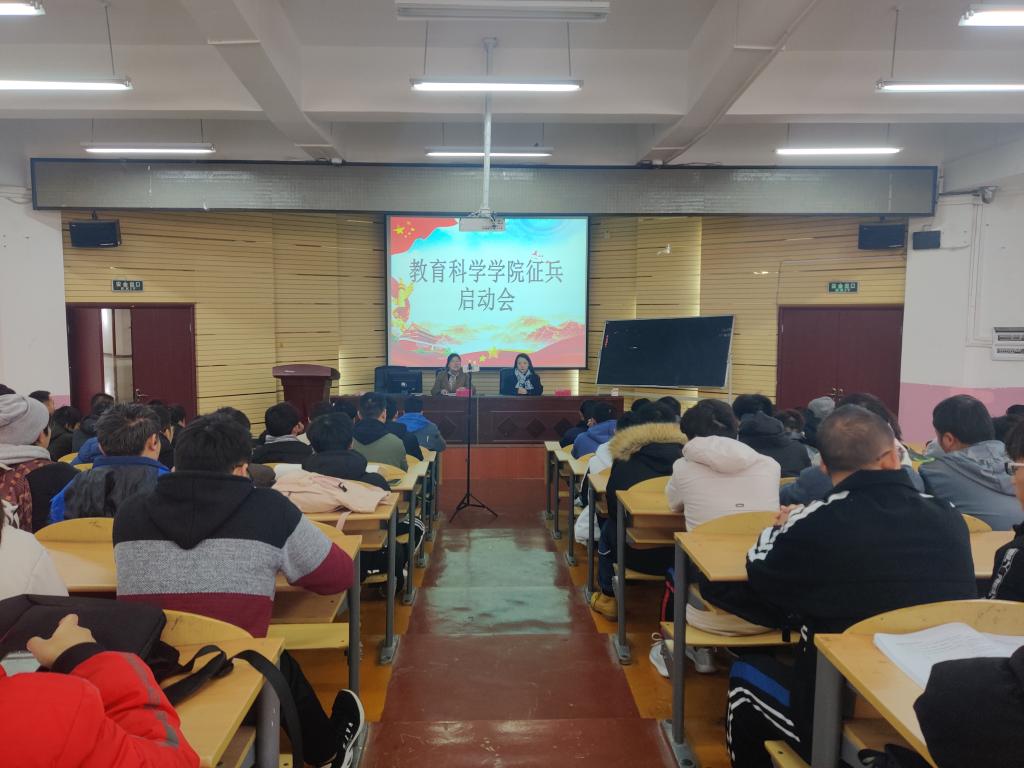 为加强征兵政策宣传,做好2021年大学生应征入伍工作,12月10日中午,教育科学学院在宁静楼125阶梯教师举行了“2021年征兵政策宣传大会”。学院党委副书记傅小芳担任主讲人,团委书记张源及学院18级、19级全体男生参加了此次会议。