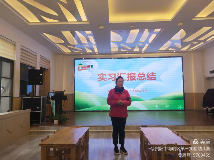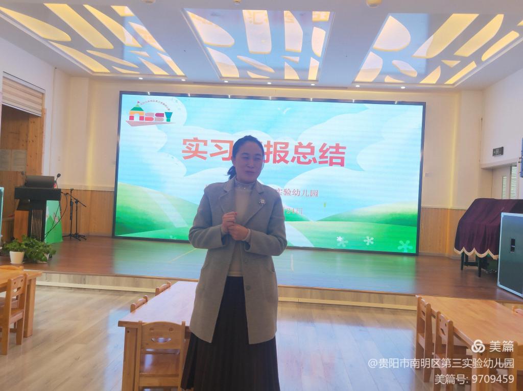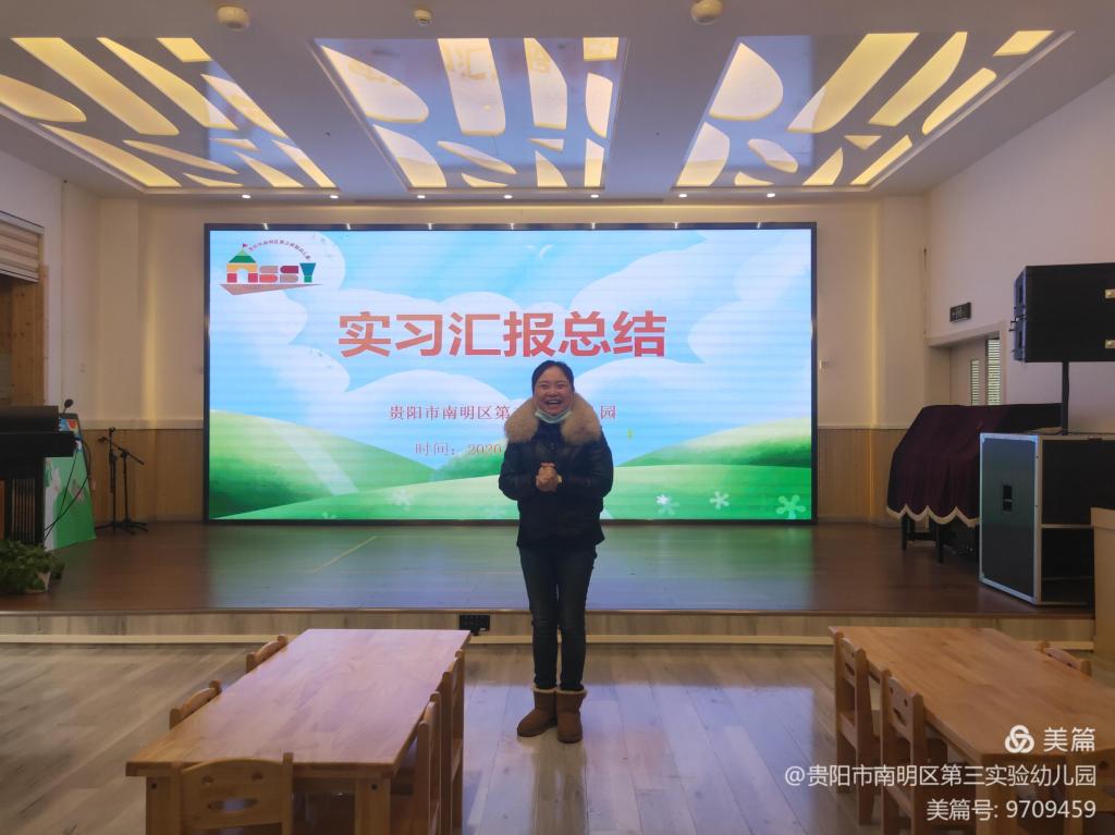 随着2017级学前教育专业学生的实习工作接近尾声,2020-2021学年度第一学期实习学生实习汇报会于2020年12月24日上午9:30在贵阳市南明区第三实验幼儿园活动大厅如期举行。参加此次会议的有贵阳市南明区第三实验幼儿园园长何丽、副园长宋元娥、保教主任何利红、园方实习指导教师,贵州师范学院教育科学学院的实习指导教师郑玉连、陈泽静、李琴以及学前教育专业的实习生也参加了此次汇报会,会议由幼儿园保教主任何利红主持。