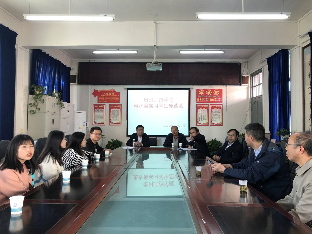 2020年10月23日,为了解我校实习生的工作情况,教育科学学院党委书记彭祥友和副院长黎平辉、数学与大数据学院教师陈松良教授和欧阳建新博士、教科院科研助理吴桂桃等一行5人,在惠水县教育局罗科长的陪同下,先后到惠水四中、惠水五中、惠水六中、惠水县中等职业技术学校、摆金中学、岗度中学等实习单位看望贵州师范学院实习生。