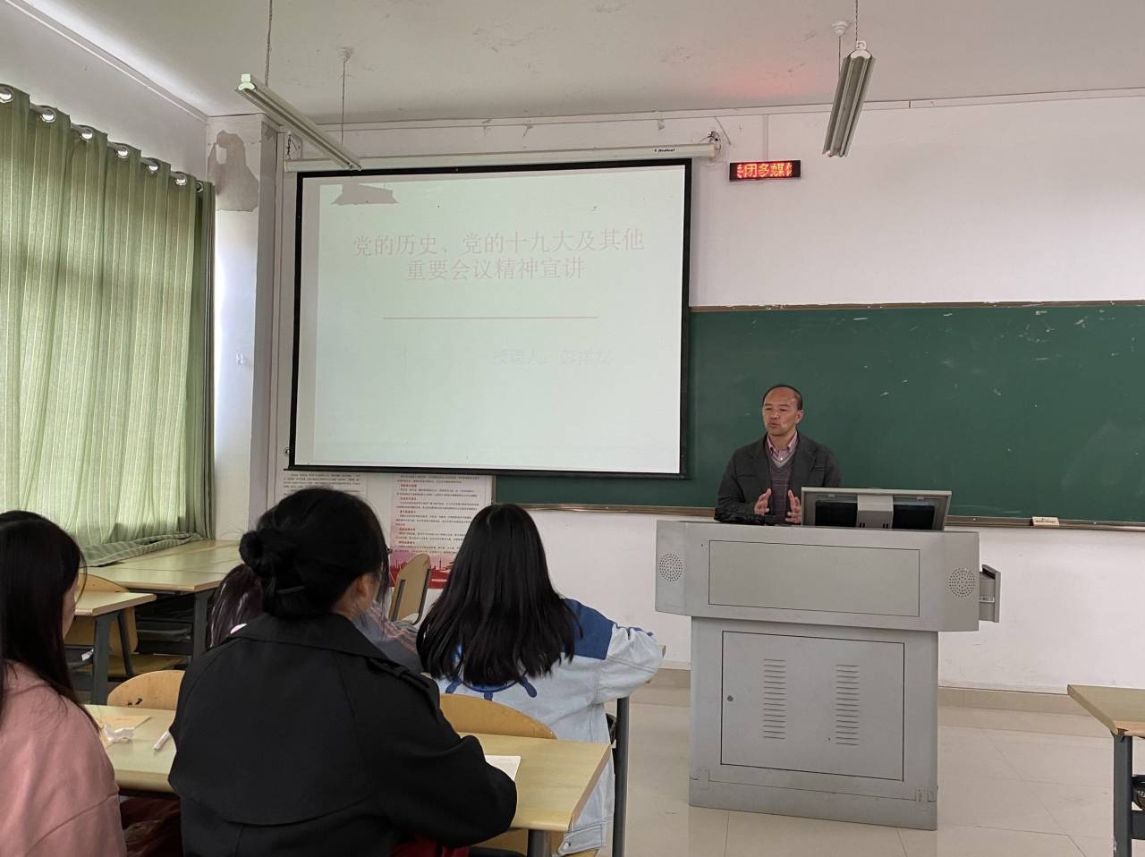 开班典礼结束后,彭祥友以“为什么要入党”、“入党之后该做什么”等问题抛砖引玉,围绕 “中国共产党的诞生、成立”、“党的发展历程及重要会议”、“党的十九大”及习近平总书记重要讲话精神等内容为主题,开启了我院第50期入党积极分子培训班的第一场讲座。讲座上,他以中国共产党的光辉发展历程为线索,从党的诞生成立到党的十一届三中全会,再到十九大的顺利召开,充分论述了中国共产党的伟大,也通过大量事例充分论证了中国共产党是历史与人民的必然选择。他强调每位入党积极分子必须坚决拥护党的领导,在生活学习中要严格要求自己,身正为范,在学生群体中起到模范带头作用,积极响应党的号召,认真学习习近平新时代中国特色社会主义思想,用理论武装头脑,提高自身的思想觉悟。