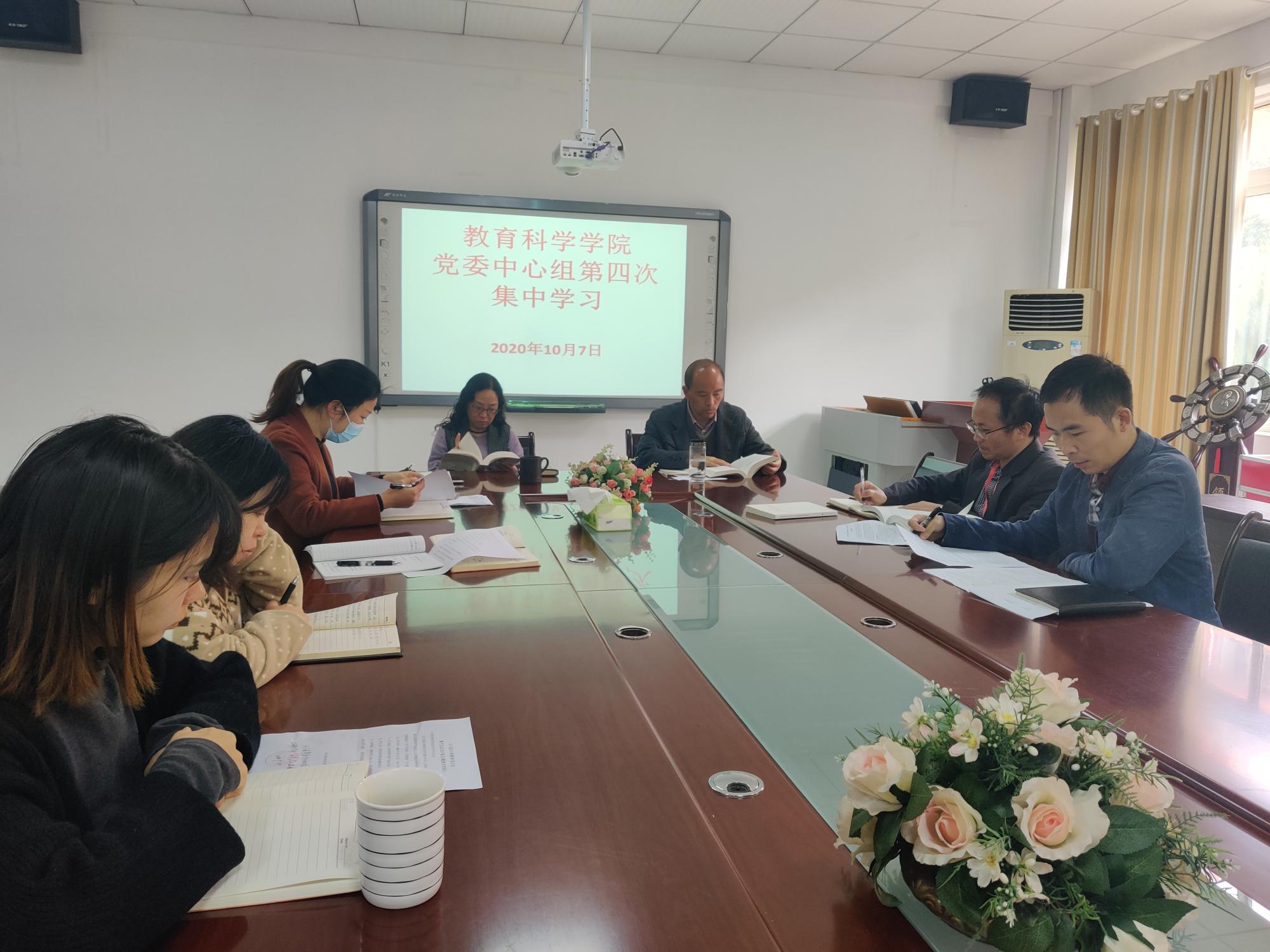 10月7日下午,教育科学学院2020年党委中心组第四次集中学习在逸夫楼321会议室进行。院党委书记彭祥友、院长刘红、副书记傅小芳、副院长黎平辉和袁川,以及团委、各党支部负责人到场参加。学习活动由彭祥友主持。