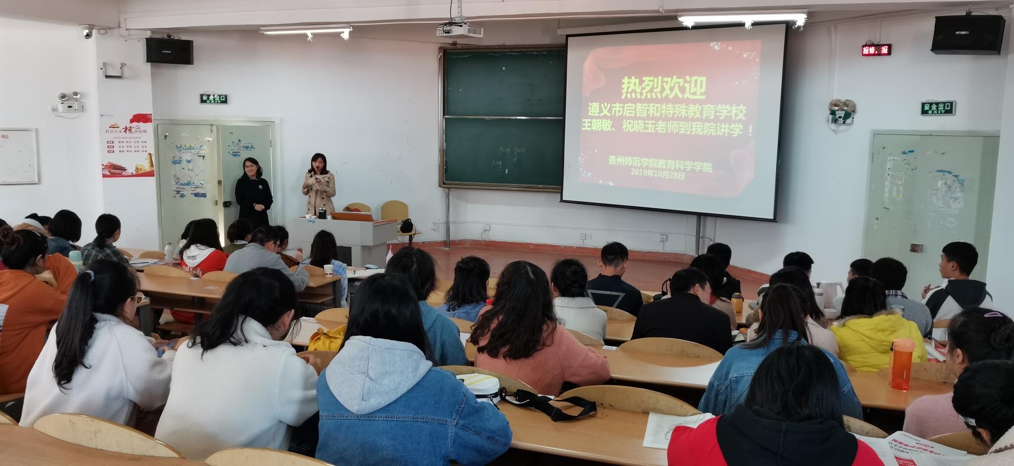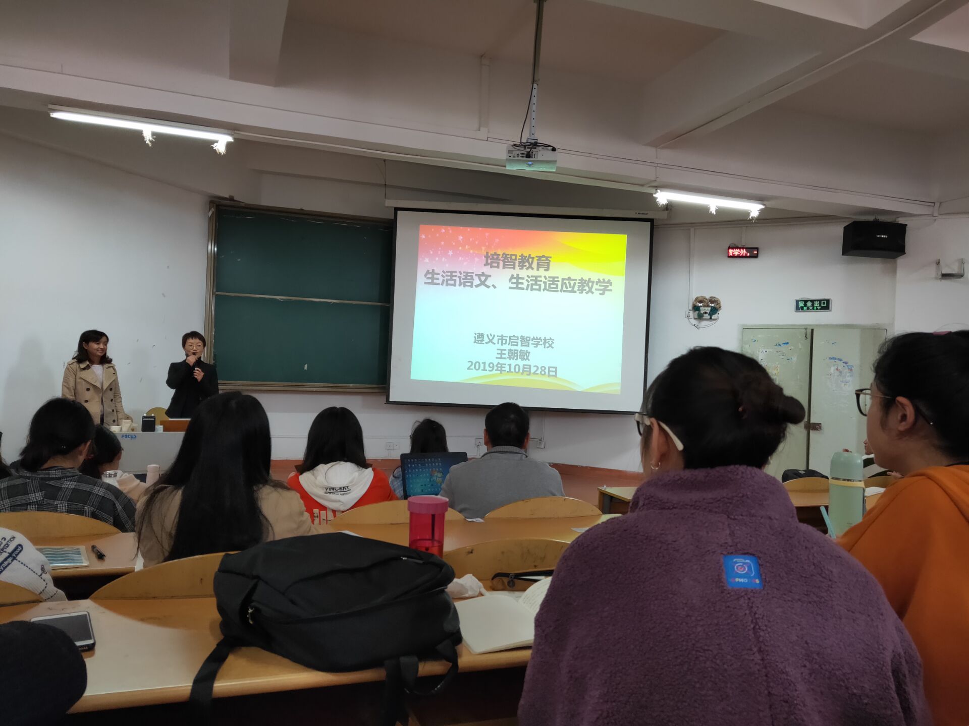 2019年10月28日,我院邀请遵义市特殊教育学校的祝晓玉老师和遵义市启智学校的王朝敏老师来给学生分享教学进程中的心得与收获。上午的讲座由特殊教育系主任杨娟老师主持,遵义市特殊教育学校的祝晓玉老师进行主题为《如何做一名有理想的特殊教育教师》的专题讲座,她主要从“视力的分级和致残原因”“尊重差异、适应需要、开展有效教学”“专业发展的规划”“专业发展的角色定位”以及“特殊教育的发展方向”五方面展开。讲座中,祝老师不仅给学生分享了理论上的知识,而且还结合自己的教学案例分享了很多特殊需要学生的表演视频,不断分析和展示教学中特殊教育教师的责任,即“三心”——细心、爱心和恒心,让在坐的听课学生们深受感动。祝老师的分享使学生们对特殊教育教师这个职业有更加清楚的认知,更加深了解了特殊教育教师职业背后巨大而又无私的奉献,不断激发起学生们的责任心和使命感。