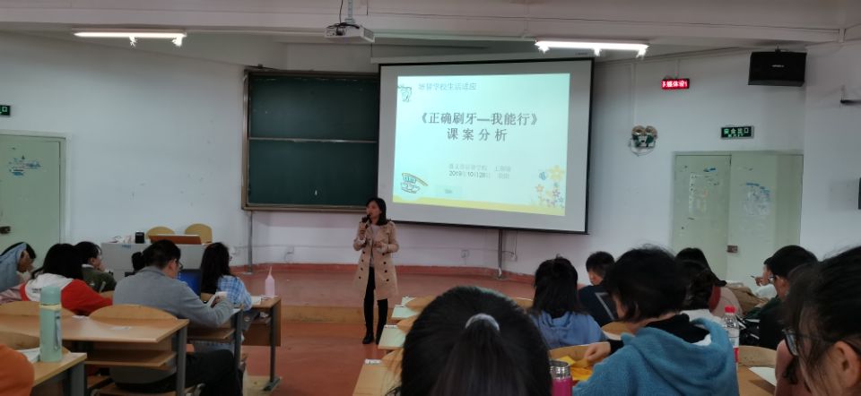 10月28日下午,讲座由吴晓英博士主持,遵义市启智学校的优秀教师王朝敏老师作题为“《正确刷牙-我能行》课案分析”的讲座,该讲座主要从如何给学生上好生活适应课来展开,通过课件展示和优质课上课、说课比赛视频的播放等让学生对“生活适应课”的上课模式和说课流程与方法等有更清晰的认识;同时她还详细地讲述了在设计一节课时如何根据学生的目前状况设计不同的教学目标,怎样选择适合学生的教学方法,以及如何对学生进行正确的反馈等。此外,王老师还通过分析她所带班级学生的具体情况来给学生们讲述实际课堂中教师们如何基于孩子们的行为和情绪上的问题选择正确的处理方式等。讲座进程中,王老师与听讲座学生积极互动,还认真解答学生目前就业方面遇到的困惑等。