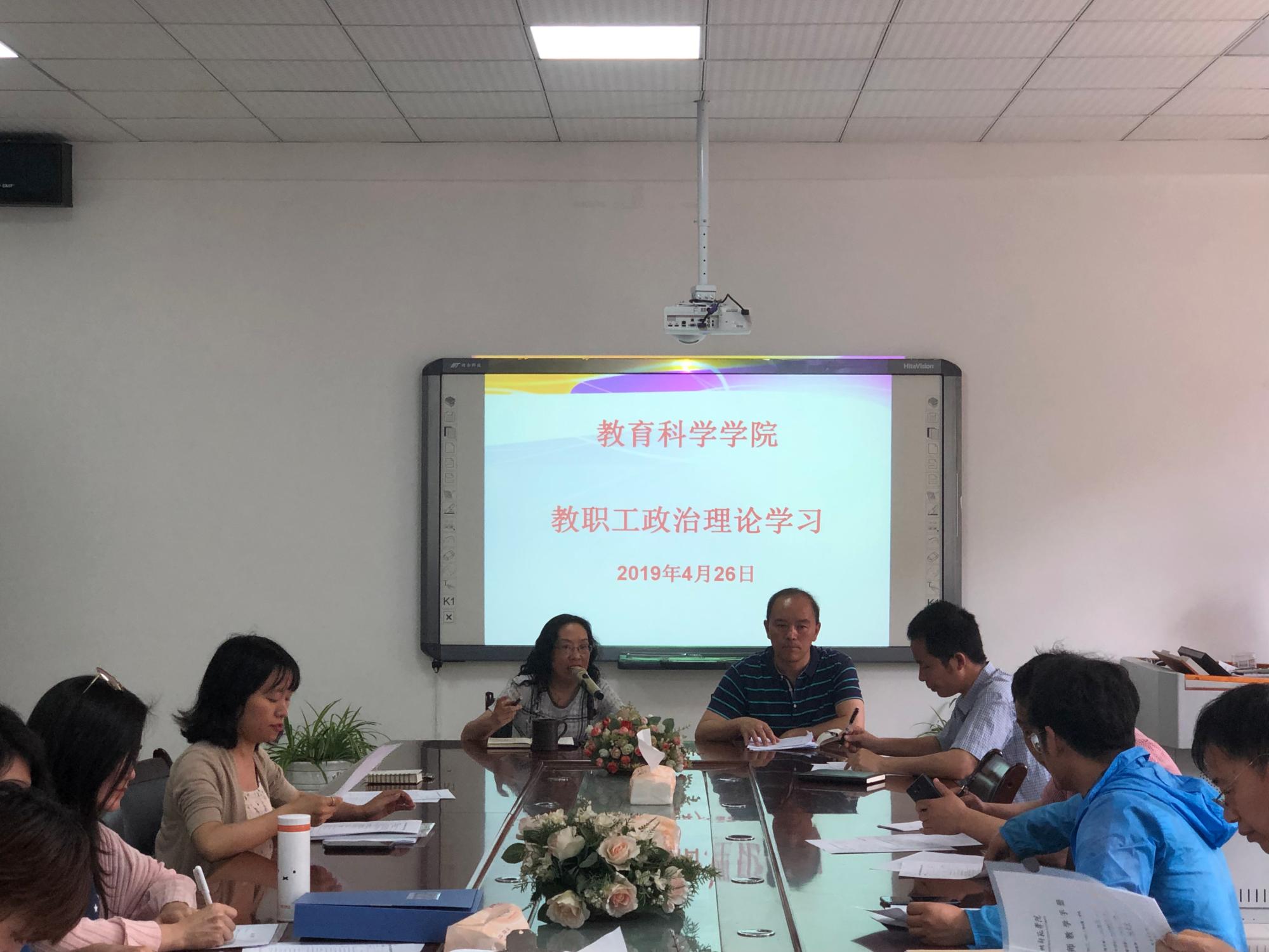 2019年4月26日下午,教育科学学院在逸夫楼321会议室召开教职工政治理论学习活动,学习活动由学院党委书记彭祥友主持,学院班子成员及全体教职工参加了学习。