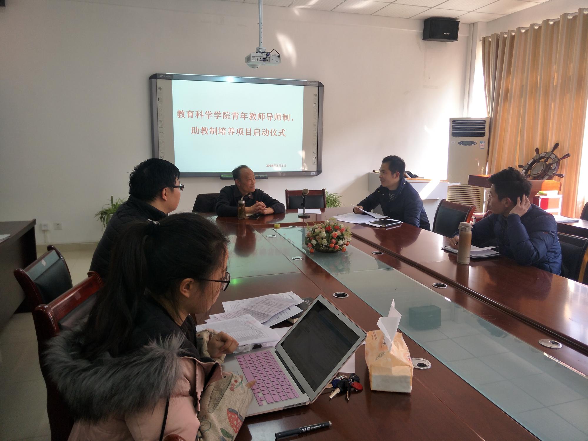 2019年3月1日下午午,2019年青年教师助教制和导师制培养项目启动仪式在教育科学学院会议室举行。袁川副院长、指导教师李建年、郑玉莲及其所指导的青年教师参加了会议。袁川副院长主持了会议。
