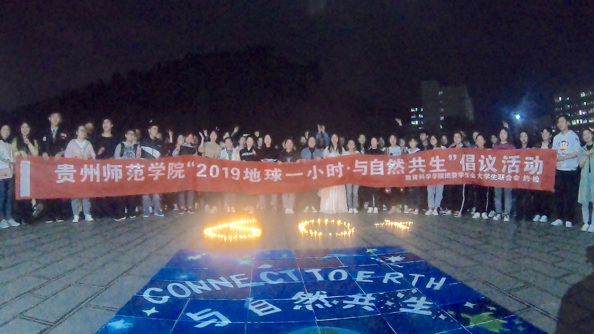 为倡议师院学子加强环保意识,对全球环保事业贡献微薄力量,由贵州千亿qy88国际官网入口团委学生会主办、贵州师范学院大学生联合会、约·绘摄氏度社团共同协办的“2019地球一小时 与自然共生”的主题活动于2019年3月22日在贵州师范学院鉴湖旁举行。