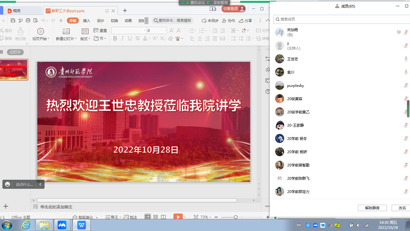 2022年10月28日下午,教育科学学院和贵州教育发展研究中心邀请中南民族大学王世忠教授莅临我院讲学,讲座围绕党的二十大精神,以“增强教育服务中华民族伟大复兴的使命感”为主题,教育科学学院、教育发展研究中心全体教师以及部分学生参加。讲座由院长宋万琚主持。