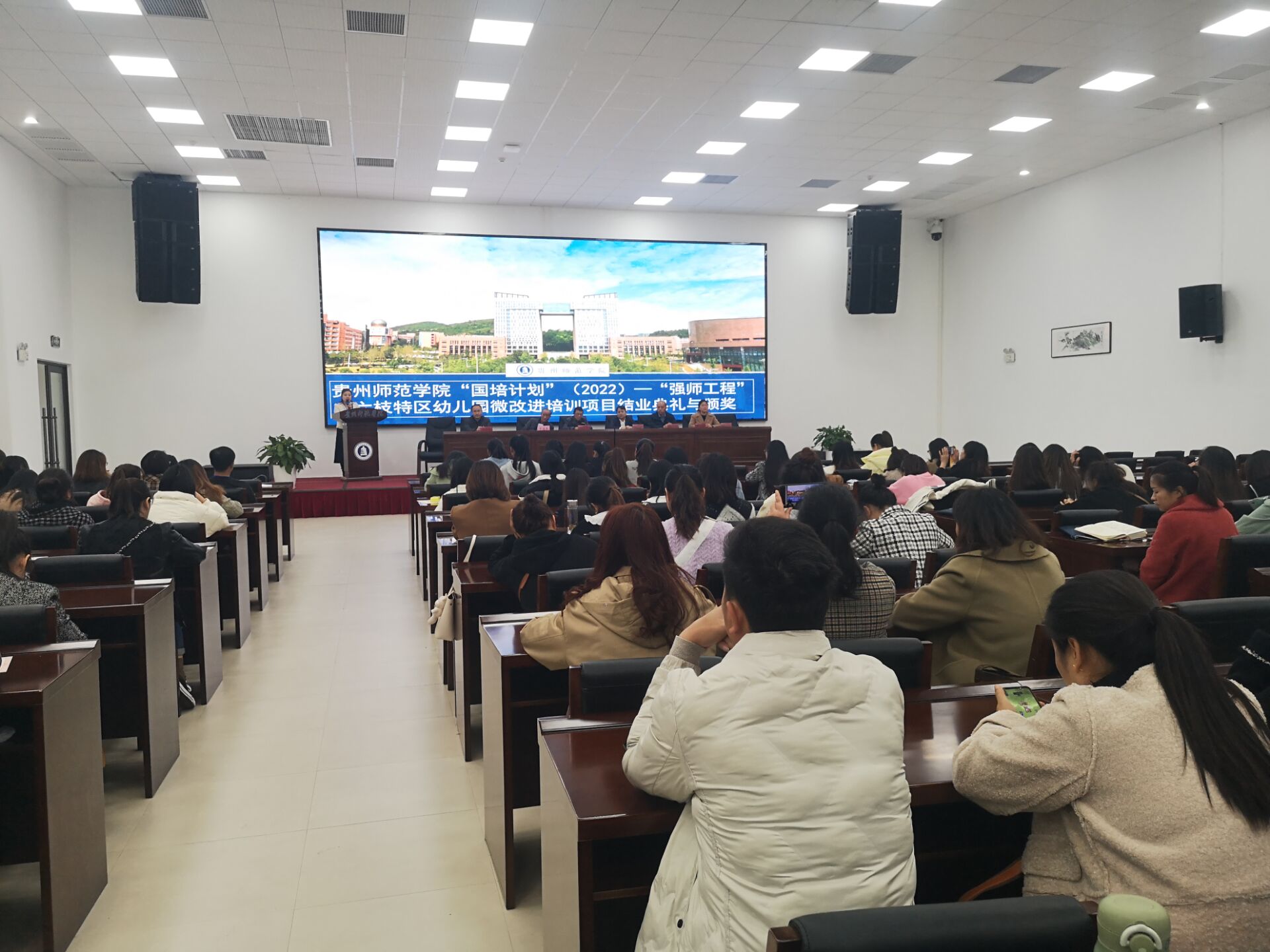 2022年11月19日下午,由贵州千亿qy88国际官网入口承办的“国培计划”(2022)——“强师工程”六枝幼儿园微改进培训项目结业典礼在贵州师范学院教师培训中心综合楼301会议室举行。我校继续教育学院党委书记韦丹、教育科学学院党委书记彭祥友、教育科学学院院长宋万据、教育科学学院党委副书记傅小芳、教育科学学院副院长黎平辉、教育科学学院副院长袁川、教育科学学院教授李建年老师、继续教育学院培训部主任吴江老师出席了本次典礼。此外,参加本次结业典礼的还有培训班的班主任团队以及一百名学员。结业典礼由教育科学学院教师沈洁主持。