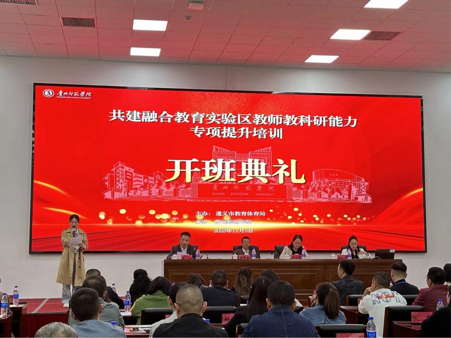 2023年11月3日,遵义市-贵州师范学院共建融合教育实验区教师教科研能力专项提升培训”班在综合楼301举办开班典礼,教育科学学院肖湘萍书记、宋万琚院长、郑玉莲教授、陈泽婧副教授、李姿雨老师、李琴老师、鲁蓓蓓老师以及遵义市120名融合教育实验区骨干教师参会,会议由教育科学学院袁川副院长主持。