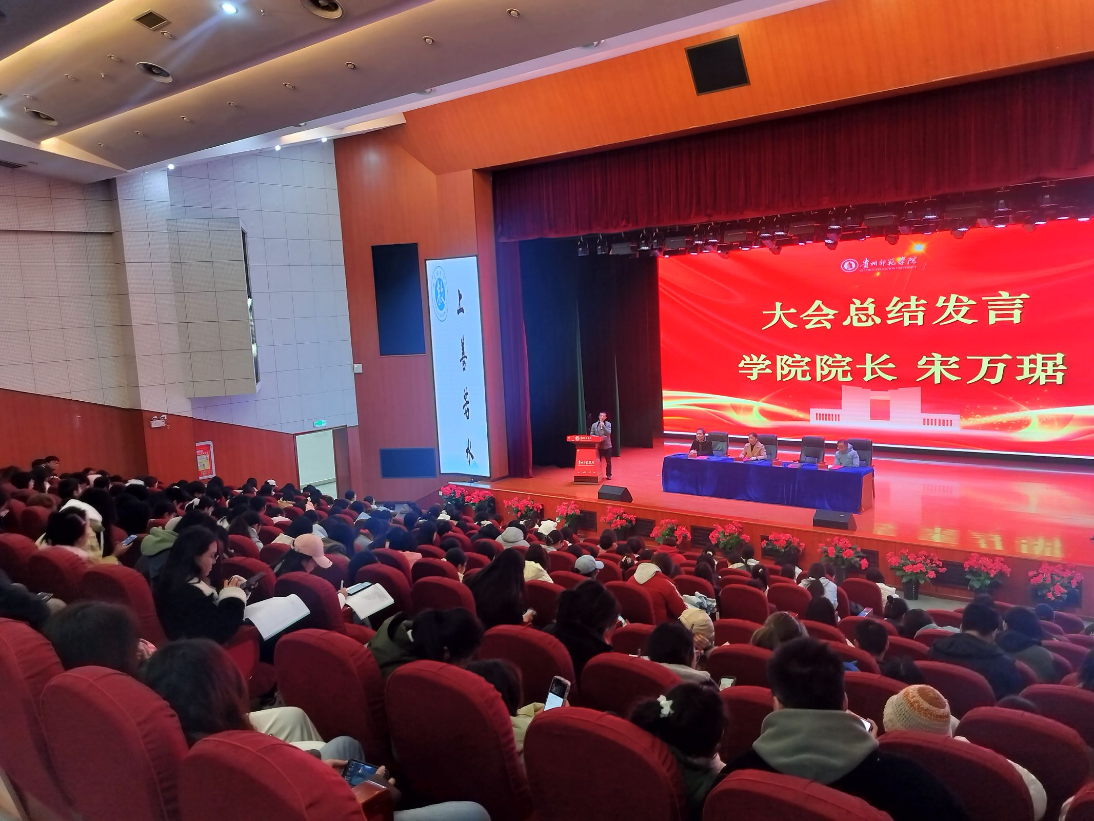 大会伊始,傅小芳对我院2024年学生工作进行了全面总结,回顾了过去一年学生工作取得的成果与经验。随后,学生代表国家奖学金获得者唐正兰、创新创业金奖项目“花开有声”团队成员代表吴月依次进行了发言,分享了自己在学习和生活中的感悟与收获,激励同学们继续努力,追求卓越。接着,会议进行到表彰环节。宋万踞宣读了2024年个人荣誉获奖名单,包括省级“优秀学生干部”、省级“三好学生”以及贵州省首届大学生职业规划大赛铜奖的获得者们,对在各个领域表现突出的同学进行了嘉奖与鼓励;黎平辉宣读了2024年国家级奖学金获奖名单及英语六级通过名单,表彰了在学业上取得优异成绩的同学;袁川宣读2024年省级集体荣誉获奖名单,肯定了集体的力量和团队的协作精神。最后,宋万踞进行总结讲话,强调了学风建设的重要性,并对未来的学生工作提出了期望和要求。