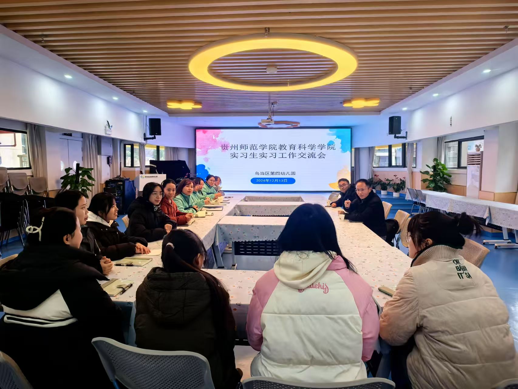 2024年12月13日上午,教育科学学院副院长黎平辉、院级教学督导莫太极老师到乌当区第四幼儿园看望实习生,并出席乌当区第四幼儿园实习工作座谈会。