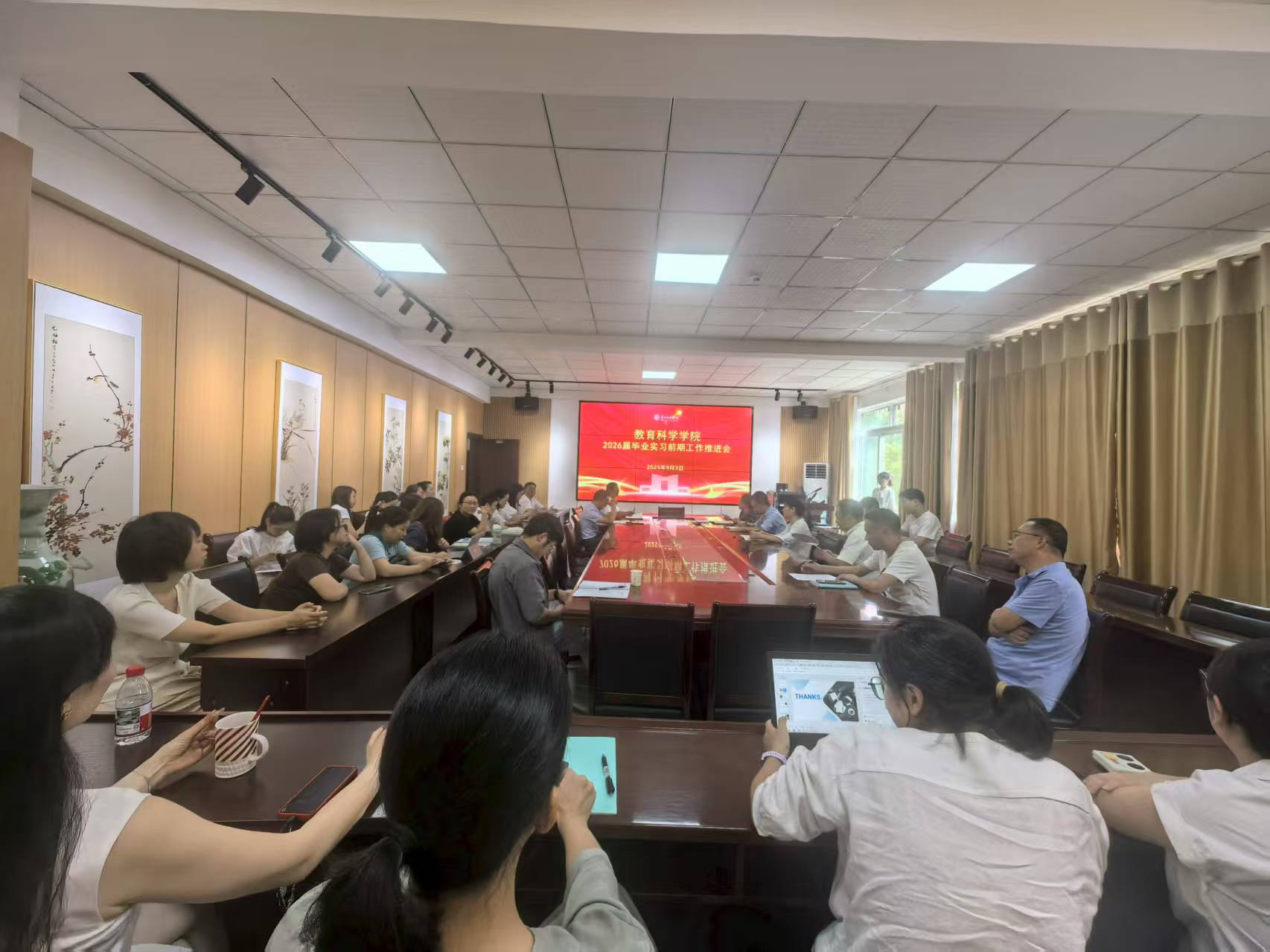 为了明晰实习期间指导教师的工作职责,提升教师实习指导的有效性,进一步保障学生实习效果,2025年9月3日,教育科学学院在逸夫楼321会议室召开了2026届实习工作推进会。党委书记肖湘萍、院长宋万琚、党委副书记傅小芳、副院长黎平辉、副院长袁川以及全体2026届实习指导教师参加了此次会议。