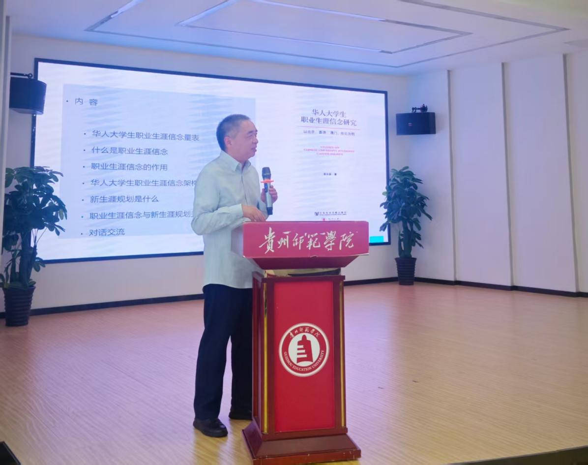 9月15日,贵州千亿qy88国际官网入口领携学派造梦社团在“一站式”大学生成长发展中心组织举办了“职业生涯信念与新生涯规划”主题讲座。活动邀请生涯教育专家彭永新博士担任主讲,职业生涯规划教师、2023级专职辅导员鲁蓓蓓,优秀校友、南明区苗苗小学心理健康教育教师何丽萍,全体2025级教育管理专业研究生以及学院的本科生代表参加了此次活动。
