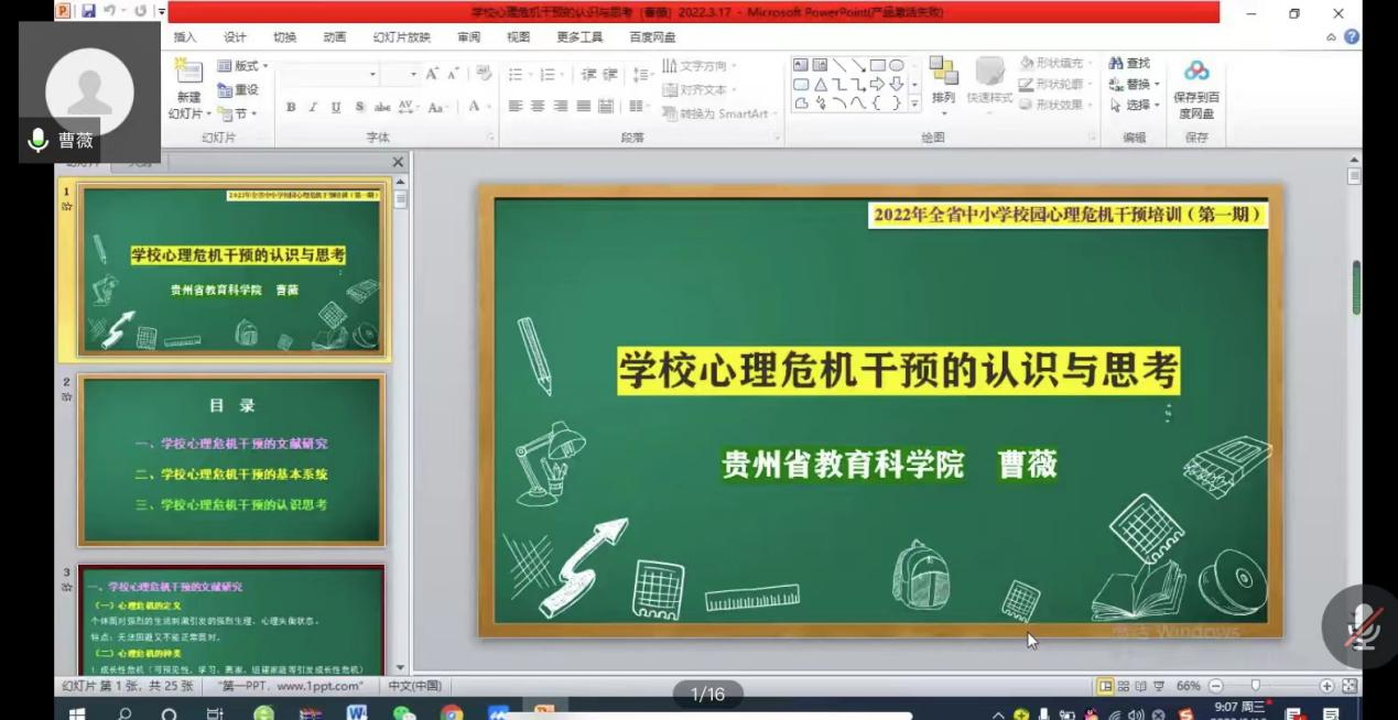 本网讯 当前,我国新冠肺炎疫情呈现点多、面广、频发的特点,防控形势严峻复杂,“外防输入、内防反弹”压力持续增加。为切实提升疫情下全省教师应对校园心理危机事件的识别和干预能力。近日,由贵州省教育科学院主办,贵州师范学院承办、教科院协办的2022年贵州省中小学校园心理危机干预专题培训(第一期)成功举办,各市(州)100多名专(兼)职心理辅导教师通过腾讯会议参加了培训。