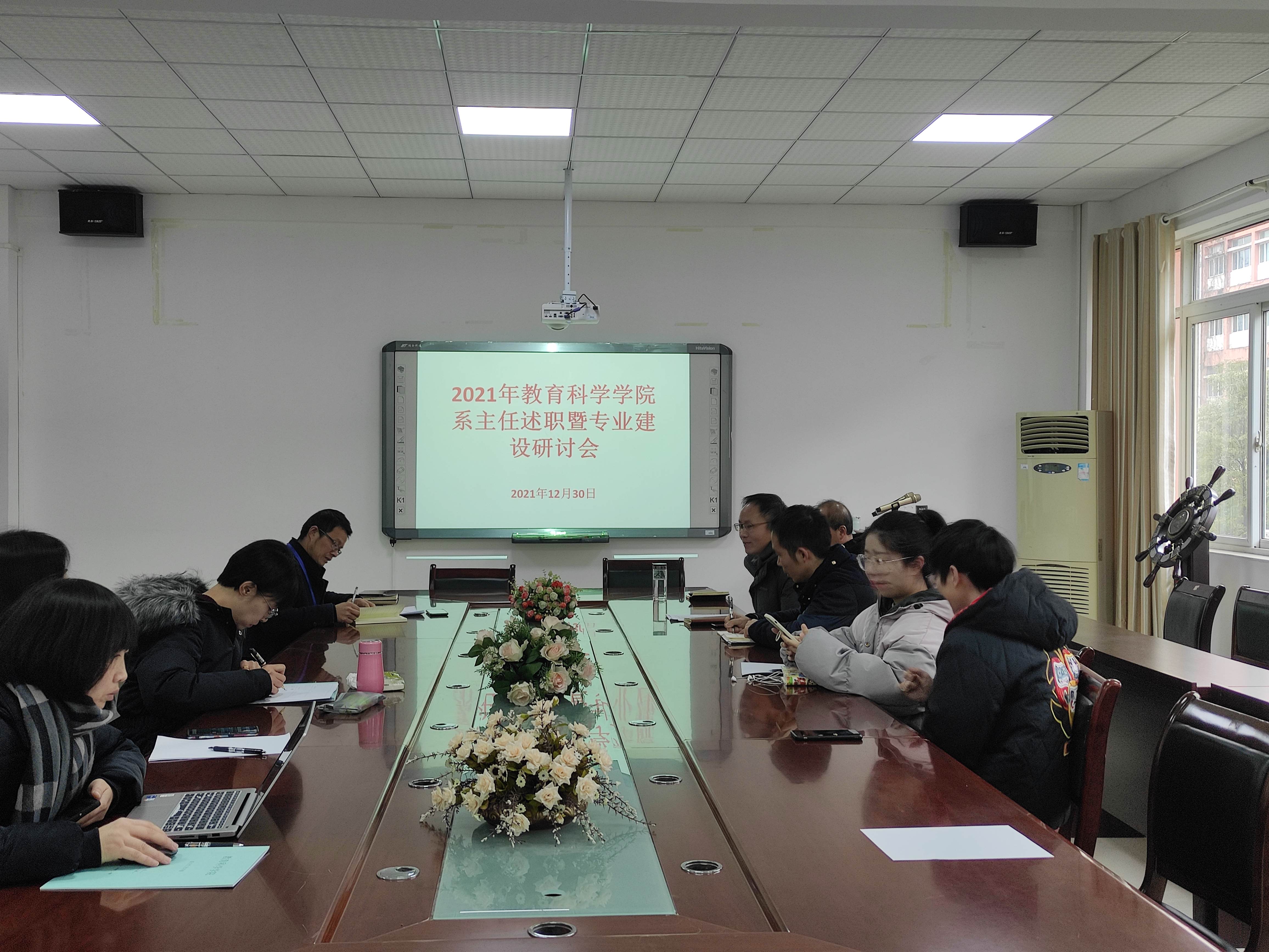 2021年12月30日,教育科学学院在逸夫楼321召开2021年系(教研室)主任、专业带头人述职暨专业建设研讨会。参加此次会议的人员有教育科学学院党委书记彭祥友、院长宋万琚、副院长黎平辉、副院长袁川、应用心理学系系主任罗凯、学前教育系主任娄小韵、艺术教育系系主任马慧慧、特殊教育系系主任朱紫桥、公共教育学教研室主任张鸿翼、公共心理学教研室主任刘婧、实践教学教研室主任邓秀平和教学督导赵羚竹。会议由黎平辉主持。