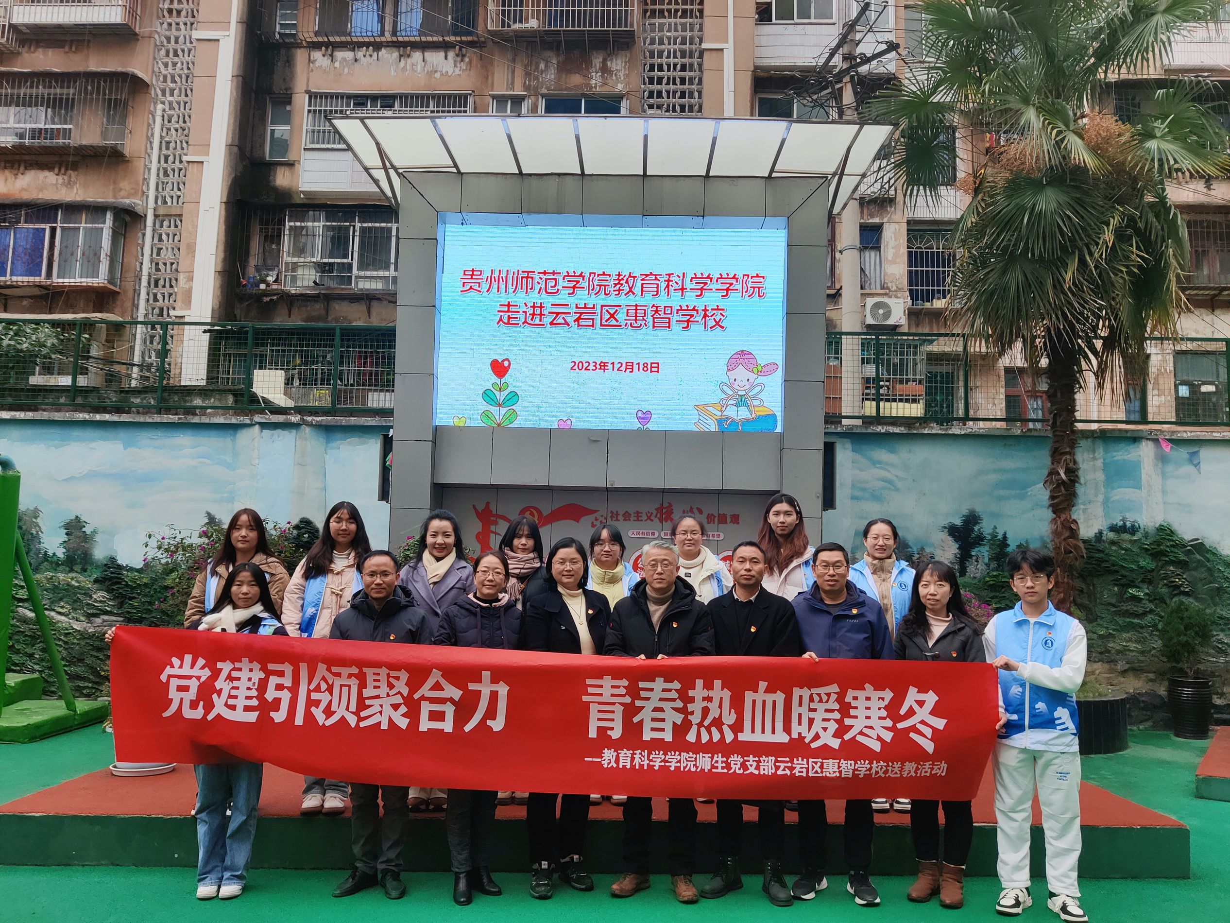 为深入贯彻落实习近平新时代中国特色社会主义思想和党的二十大精神,围绕“立德树人”根本任务,强化协同育人机制。2023年12月18日,在教育科学学院党委书记肖湘萍、党委纪检委员、副院长黎平辉的带领下,教师党支部书记张鸿翼、学生党支部书记张源、特殊教育系主任雷经国以及部分师生党员与云岩区惠智学校党支部党员联合开展主题党日活动。