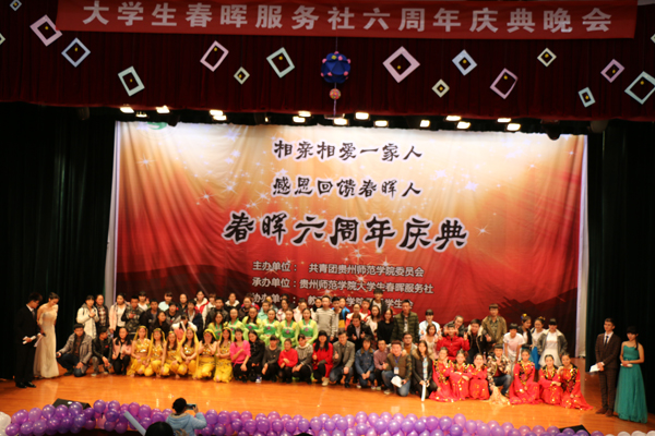 2015年12月6日18:00,教育科学学院大学生春晖服务社在逸夫楼演播厅举行了以“相亲相爱一家人,感恩回馈春晖人”为主题的六周年庆晚会活动。参加此次活动的领导和嘉宾有全国高校春晖联盟指导老师田芳、王博、贵阳各大高校的学生春晖代表及我校教科院团委书记傅小芳老师。