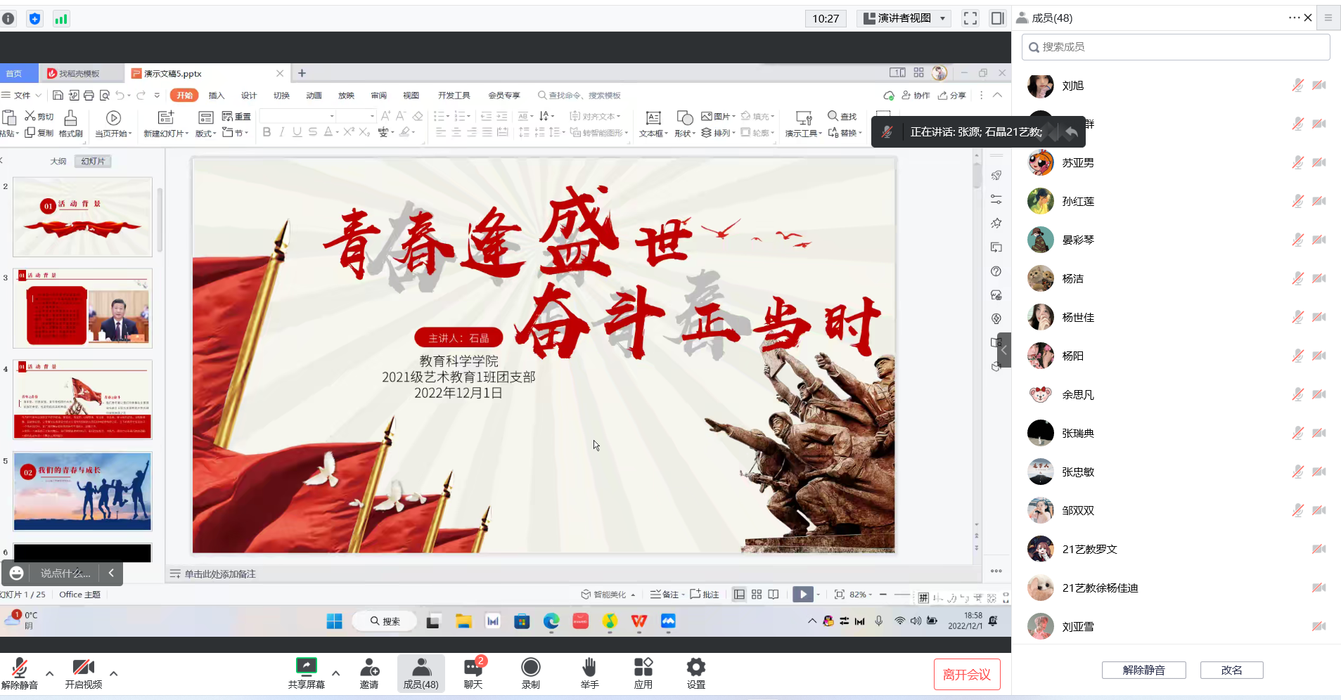为庆祝党的二十大胜利召开,增强青年学子的历史责任感和使命感,丰富疫情期间的大学文化生活,提高身心健康素质,12月1日晚七点,2021级艺术教育团支部举办了“青春逢盛世,奋斗正当时”线上主题团日活动。参与此次团日活动的有校团委社会实践部部长张维域、院党委副书记傅小芳、院团委书记张源、辅导员申苒以及2021级艺术教育班全体成员,活动由班级团支书石晶主持。